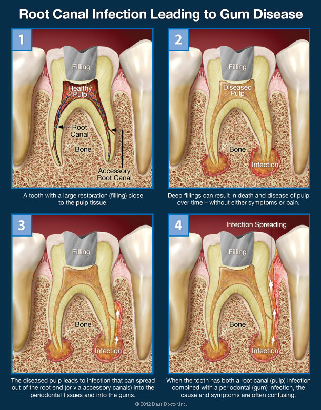 But it's also possible for the infection to be spread by the exact opposite pathway. In this case, an infection that originated in the gums (commonly due to periodontal disease caused by a buildup of plaque) may have has traveled through small passageways called accessory canals, which are located in between a tooth's roots, or on the sides of the roots. The infection can then extend into the tooth's pulp. If your teeth are fractured, it's even easier for disease to spread.