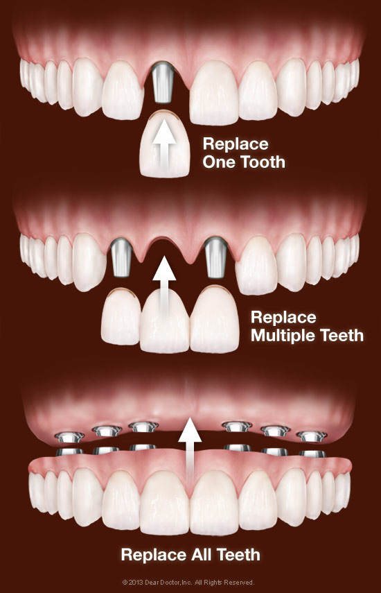 You can replace a single tooth, multiple teeth or all your teeth with implants (View Examples). You don't even need one implant for every missing tooth. As few as two Implants can support a removable lower denture, while as few as four implants can provide a full, permanent set of top or bottom teeth.